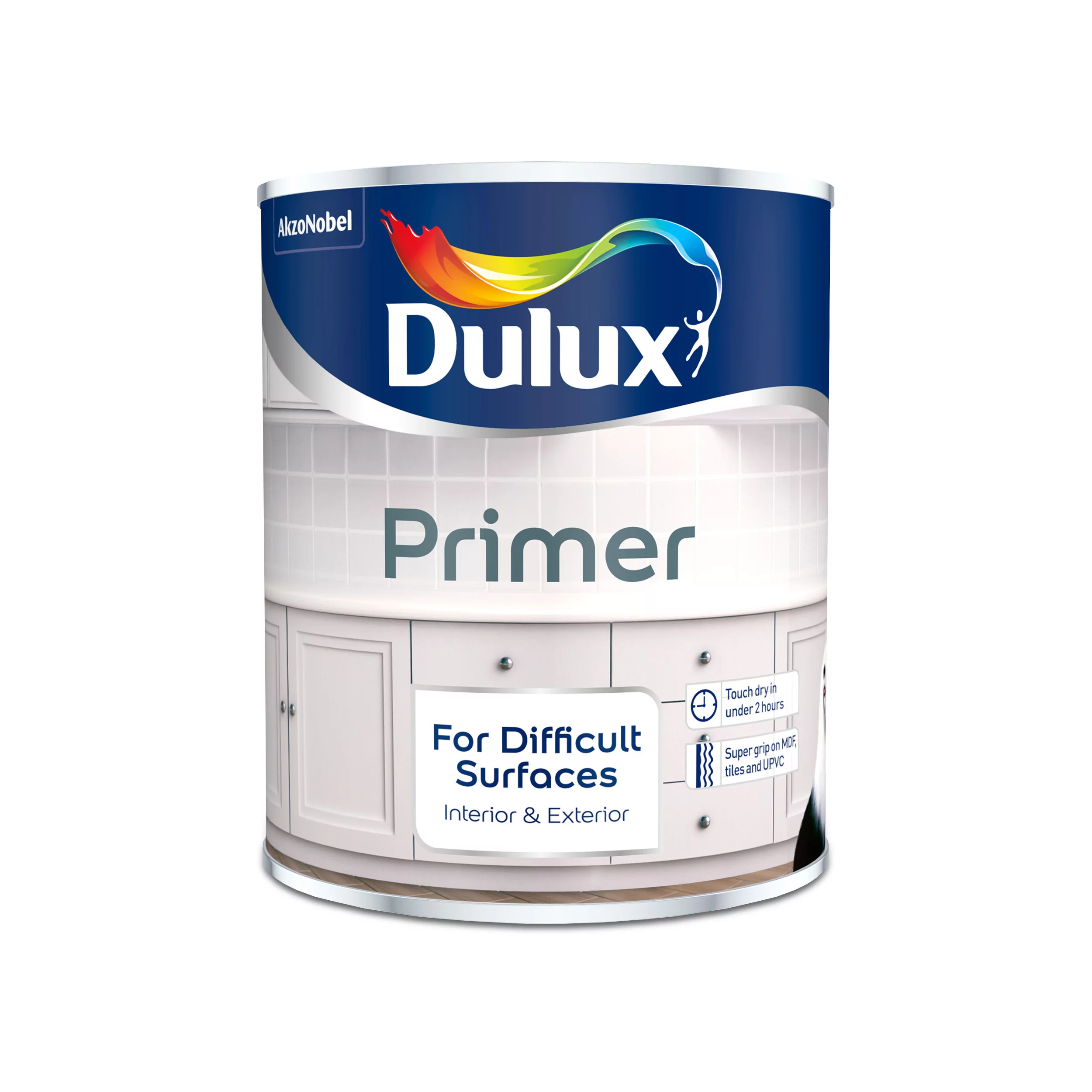 - Instructions for Use – Stir thoroughly before use to ensure completely mixed. Apply 1 coat of Dulux Primer for difficult surfaces with a brush or short pile roller. When fully dry, minimum 4 hours, apply an appropriate Dulux paint systems. Touch dry in 1-2 hours, leave 4-6 hours to fully dry.