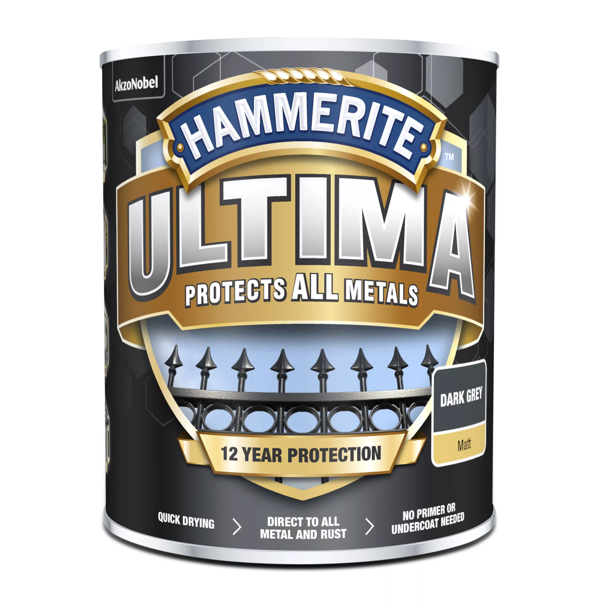 This matt metal paint from the Hammerite Ultima range is the perfect choice to refresh your home exterior. Made to provide a rich, durable finish on multi-surface, you can be sure that this paint will look brilliant for longer. Dark Grey is a stunning shade of grey that will suit any exterior design. The topcoat should be applied on any iron surfaces to create a consistent finish. Ensured to provide a long-lasting matt finish, this metal paint achieves a beautiful look, without compromising on quality. You can buy exactly what you need to complete your decorating job, as this 750ml size will cover up to 7.5 mยฒ on average. For the best outcome, apply using a brush. It will dry quickly between coats meaning you can recoat it in 4 hours. Resistant to water and rust, it’s suitable for use in your outdoor space. Furthermore, you can be assured that this water-based paint is safe for you in your home, as it has minimal VOCs.