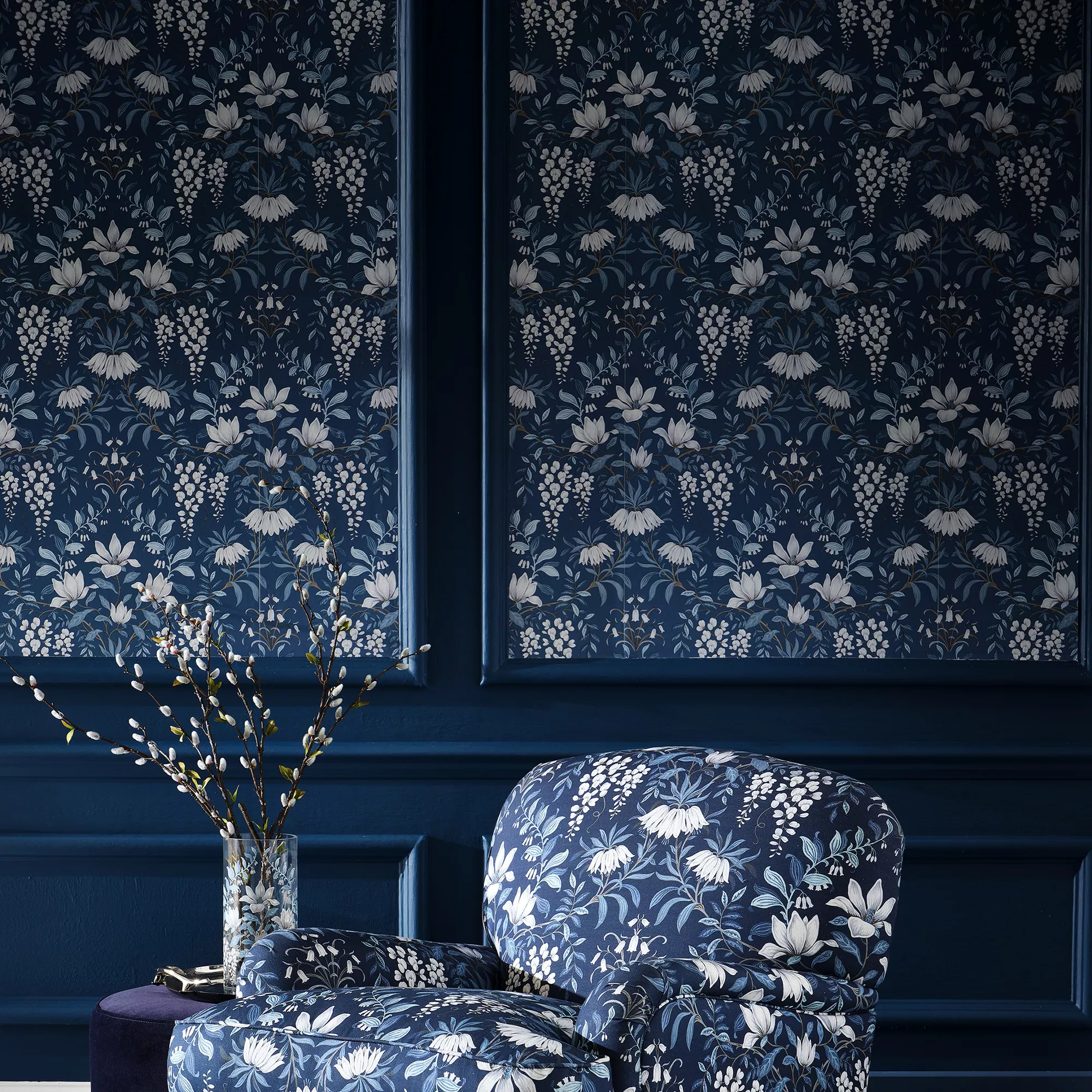 A beautiful and sophisticated floral featuring painted white flowers and swirling patterns of leaves. In dark seaspray tones Parterre brings a modern feel to a vintage style pattern.