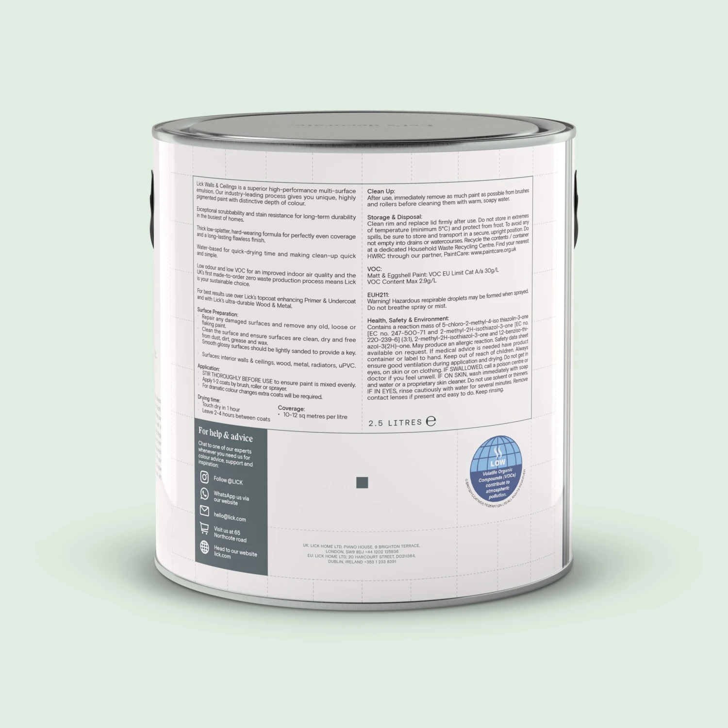 Lick hand-pick the finest pigments for their signature depth of colour and superior coverage. This high-quality formulation is designed to cover up imperfections with a uniform, flawless finish. Feel soothed with Green 11, a light pastel green with cool grey and white undertones, perfect for creating restful spaces. Lick’s mid-sheen eggshell finish is satin-smooth. A hard-wearing, wipeable and high-pigment finish to weather scuffs and scrapes for years to come. Super durable against steam, moisture and water. You can cover 10mยฒ – 13mยฒ per litre, and Lick recommends you apply two coats for maximum long-term durability – just make sure your surfaces are clean and dry before you start decorating.
