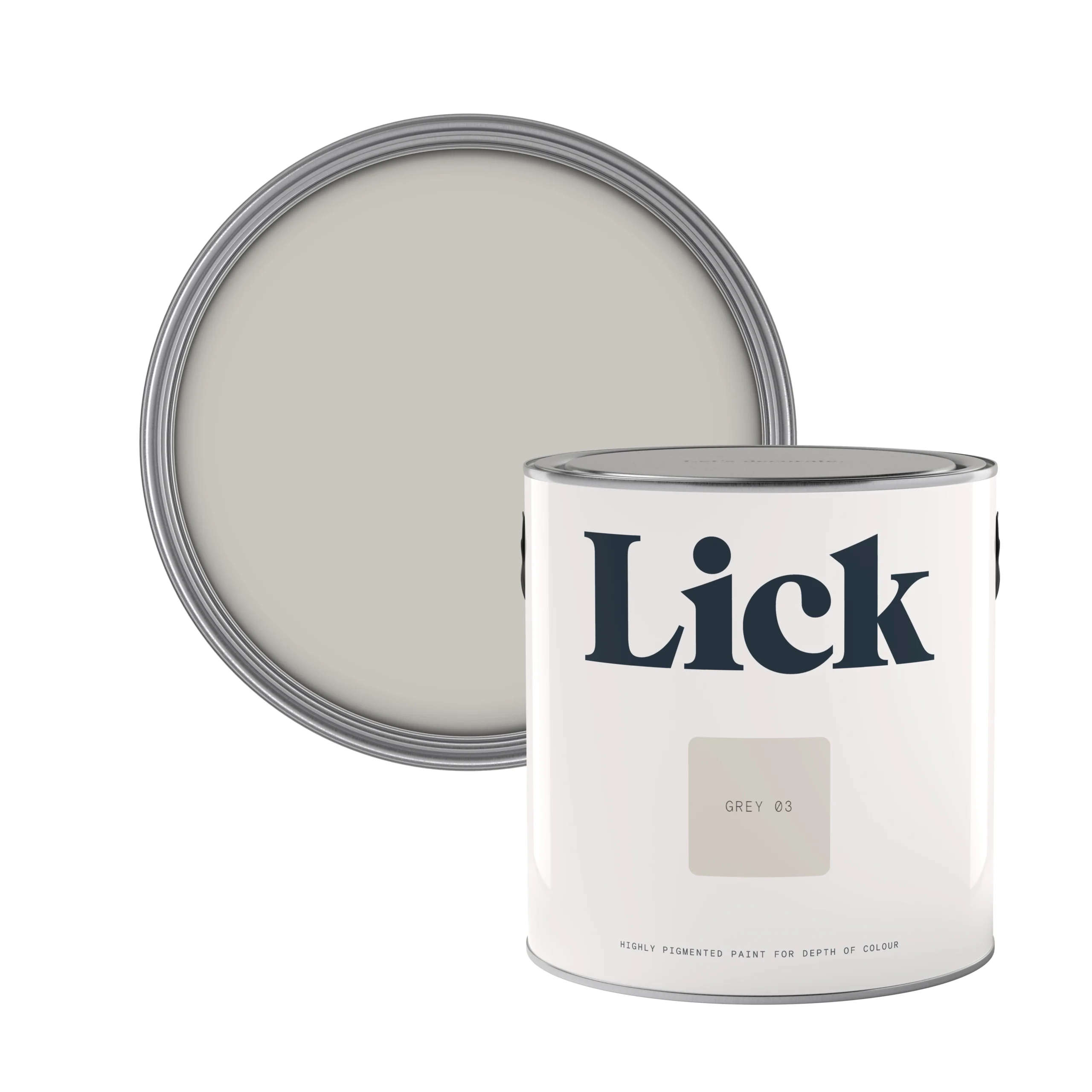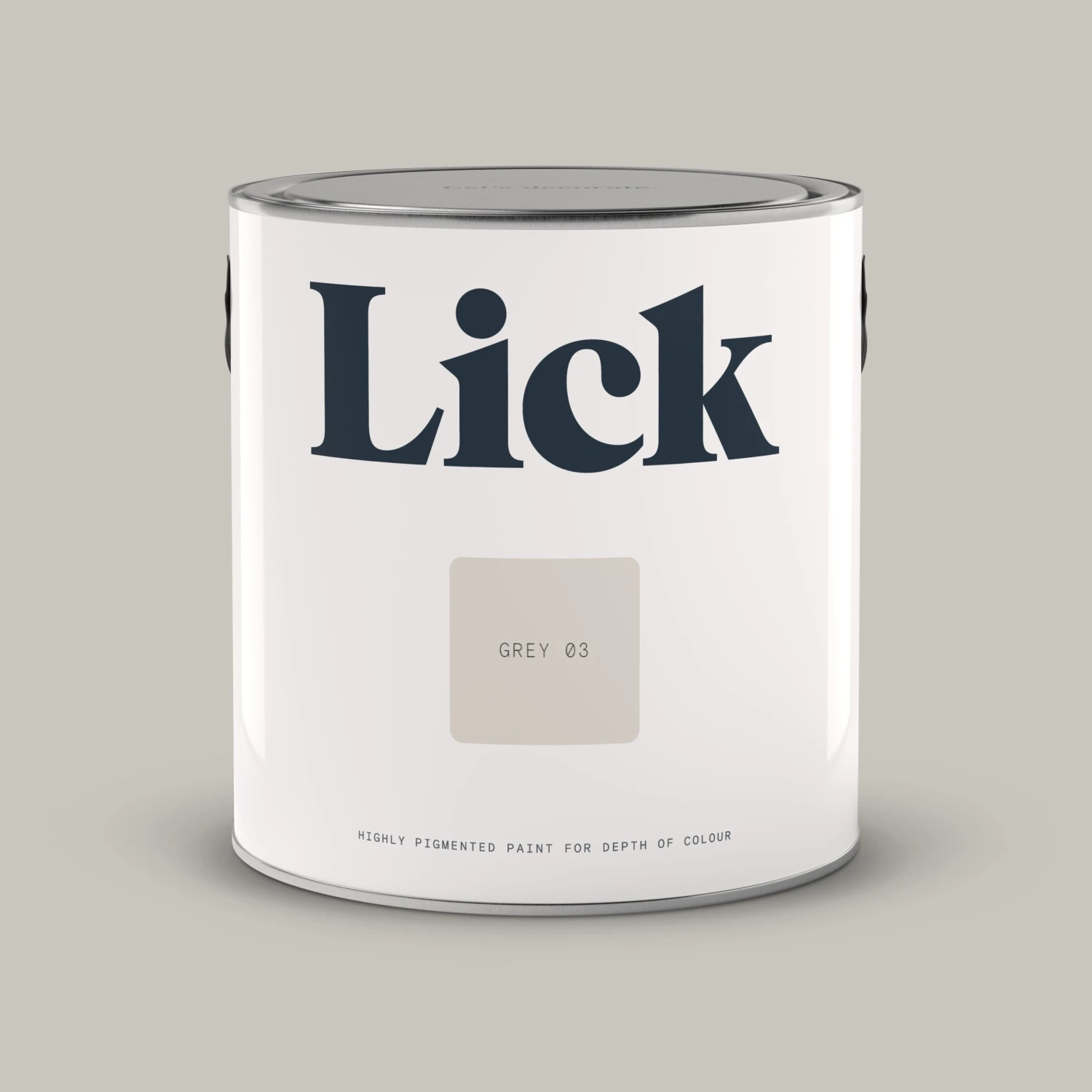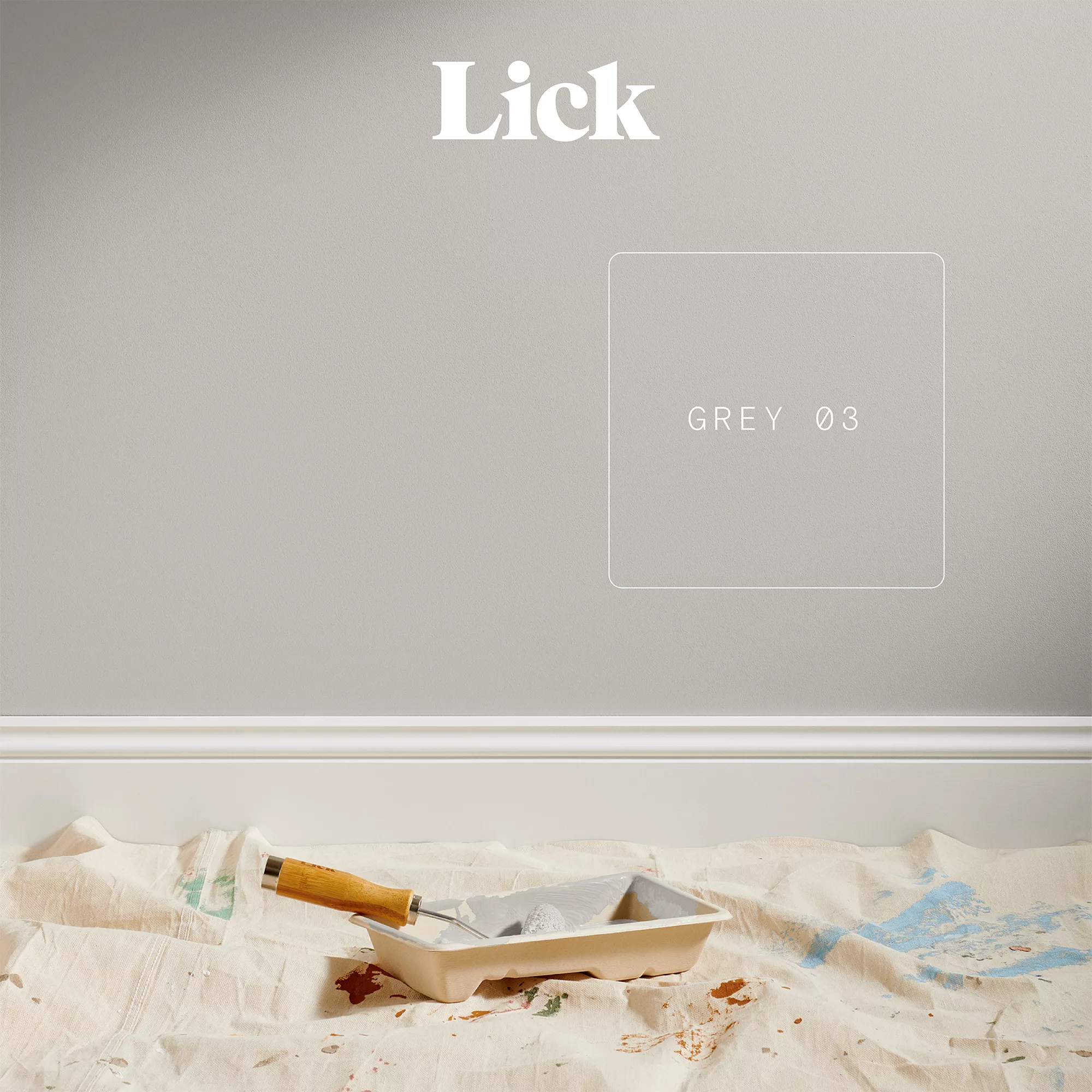 Lick hand-pick the finest pigments for their signature depth of colour and superior coverage. This high-quality formulation is designed to cover up imperfections with a uniform, flawless finish. Create a cocooning your space with Grey 03’s soothing calming qualities brought by its light grey shade with warm purple undertones. Lick’s mid-sheen eggshell finish is satin-smooth. A hard-wearing, wipeable and high-pigment finish to weather scuffs and scrapes for years to come. Super durable against steam, moisture and water. You can cover 10mยฒ – 13mยฒ per litre, and Lick recommends you apply two coats for maximum long-term durability – just make sure your surfaces are clean and dry before you start decorating.