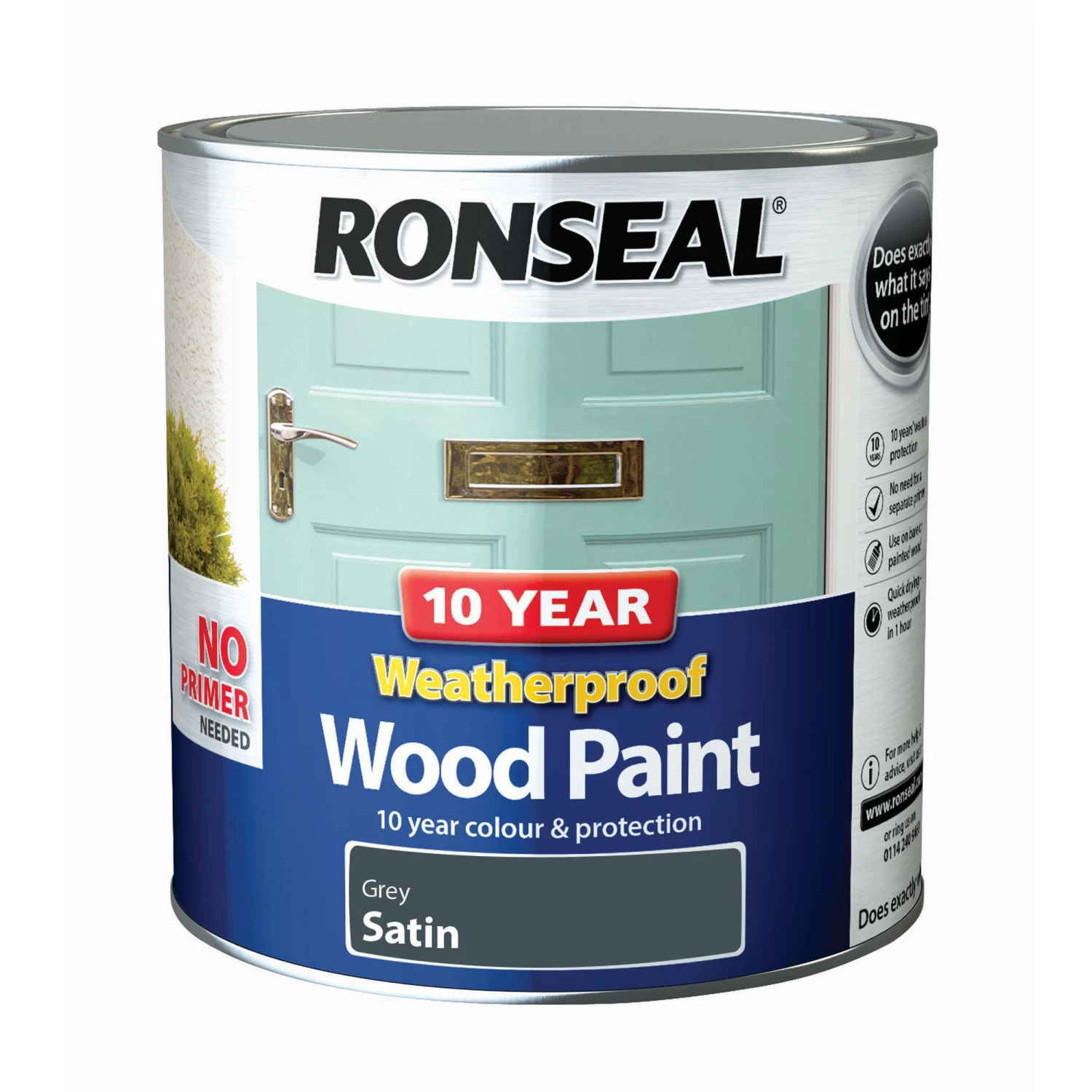 A reliable Ronseal exterior satinwood wood paint that is a great choice to give your home a refresh. Grey is a clean colour that will add a contemporary feel to your scheme. It can be applied on any wood surfaces to create a consistent finish. After application, this wood paint will accomplish a flawlessly satinwood surface that will look good as new for a long time. This 2.5L size will cover up to 21 mยฒ on average, so you can buy exactly what you need to complete your decorating job. For the best outcome, apply with a brush. It will dry quickly between coats meaning you can recoat it in 4 hours. Made with protective technology, this paint is resistant to cracking, allowing you to free yourself from the worries of everyday damage to your new surfaces. Furthermore, you can be assured that this water-based paint is safe for you in your home, as it has minimal VOCs.