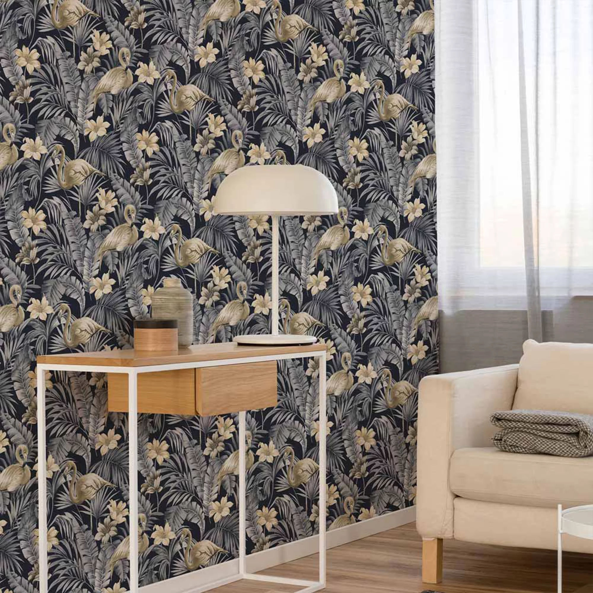 Dark and moody with a sophisticated edge, Superfresco Easy Sandrine incorporates a classic design of floral patterns with the contemporary display of golden flamingos. A wonderful wallpaper to bring a touch of class and elegance to a bedroom within your home.