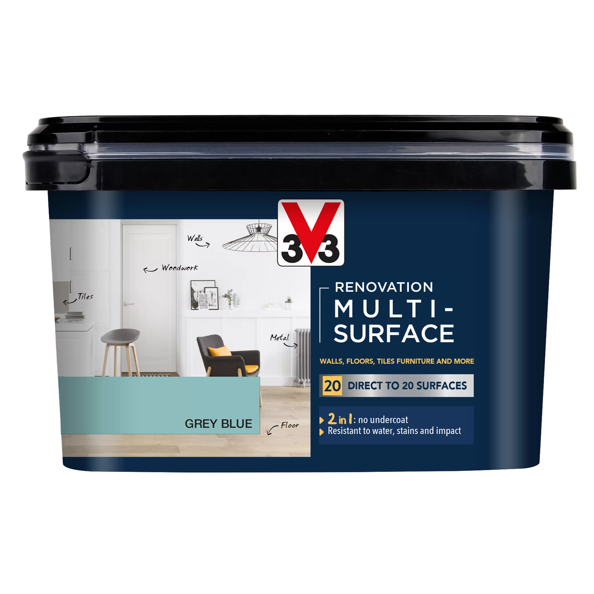 - V33 Renovation Multisurface Paint is a great solution when tackling multiple projects. Easy to apply, with a high coverage and perfect finish on 20 different surfaces including wood, tiles and metal. It allows you to transform your living spaces with a range of vibrant colours.